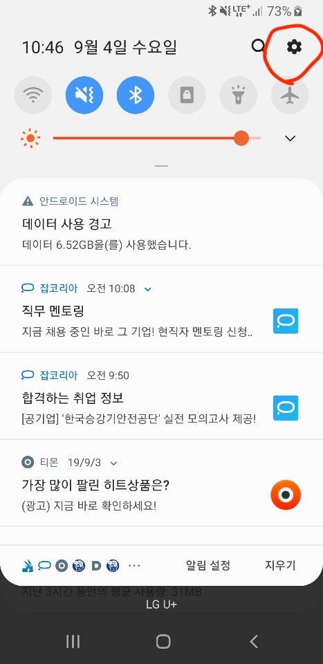 일단 폰 화면 위쪽을 쓸어내려서 아래와 같은 화면이 나오게 한 다음, 톱니 모양의 아이콘을 탭해서 설정으로 들어간다.